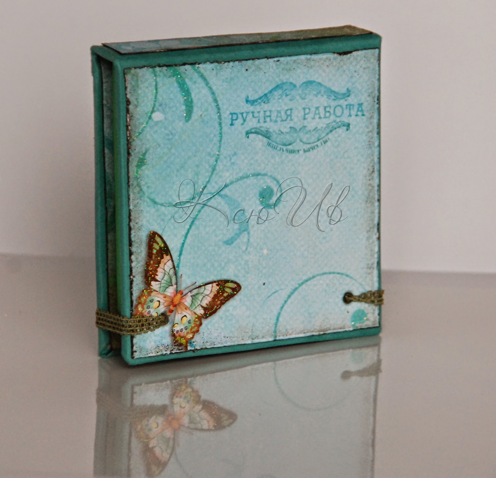 Для украшения одного из блоков я использовала бабочку. Но так как с обратной стороны бумага у меня полосатая, я вырезала их две и между собой склеила, а торец обработала наждачкой. |